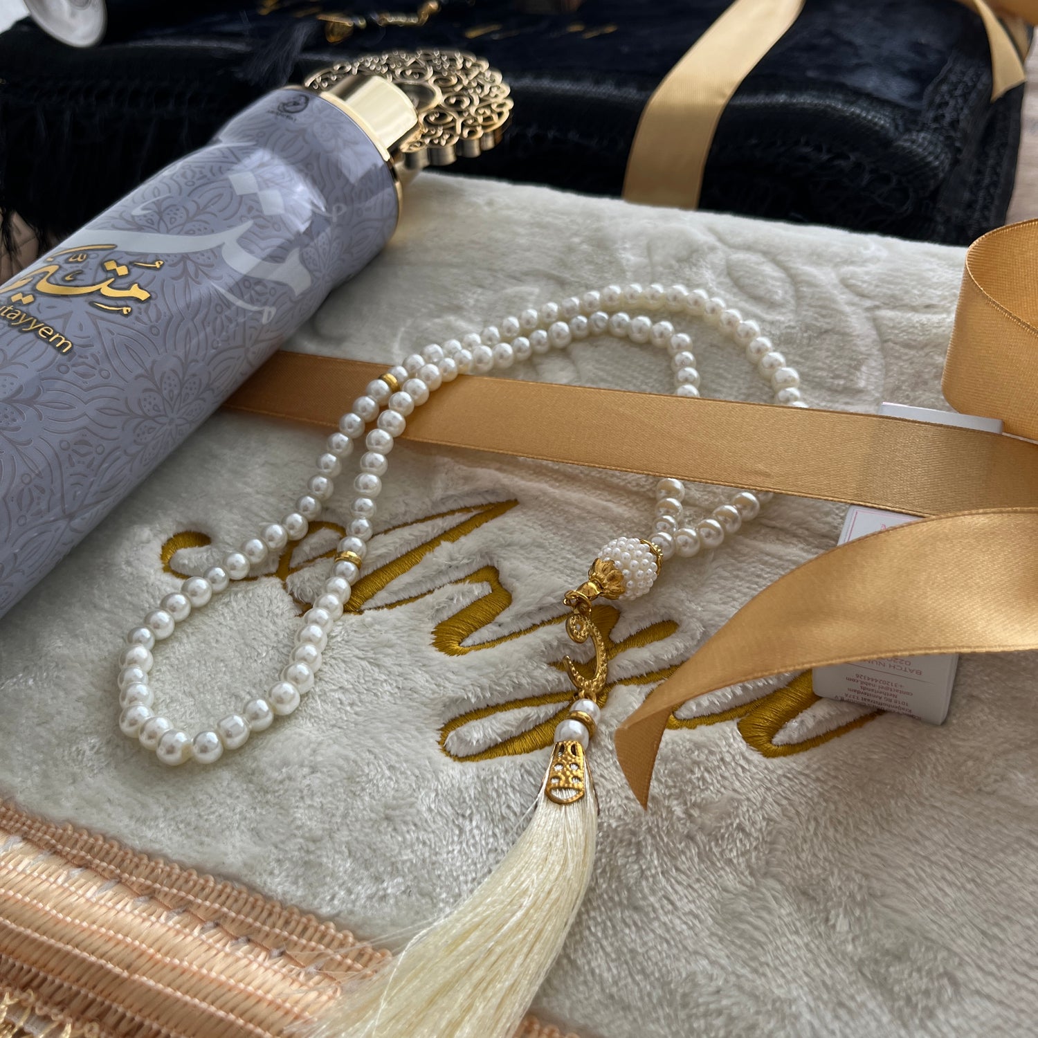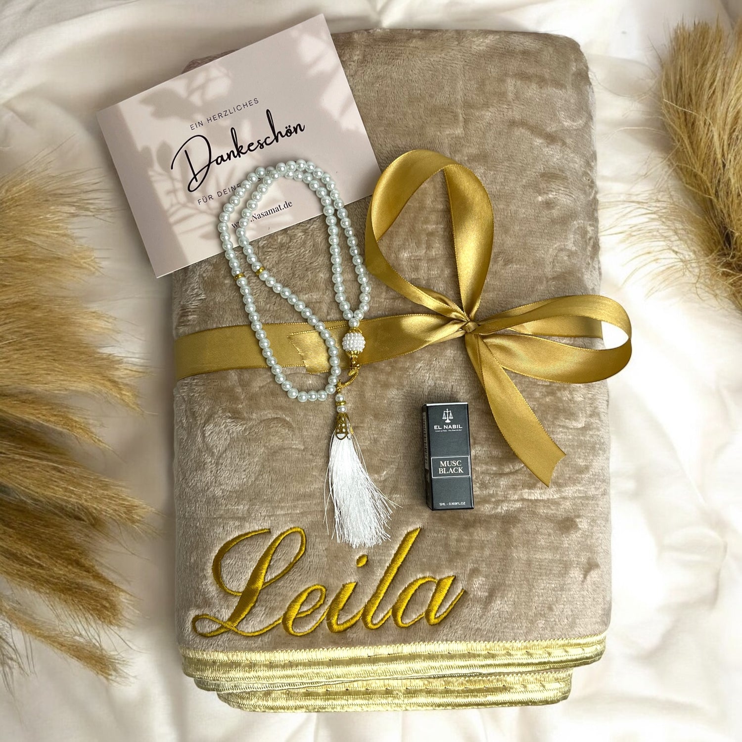 Das Gebets Bundle beinhaltet einen Gebetsteppich mit Namen, ein Duftöl von El Nabil, eine Flasche 500ml ZamZam Wasser und eine Musk Tahara Creme.